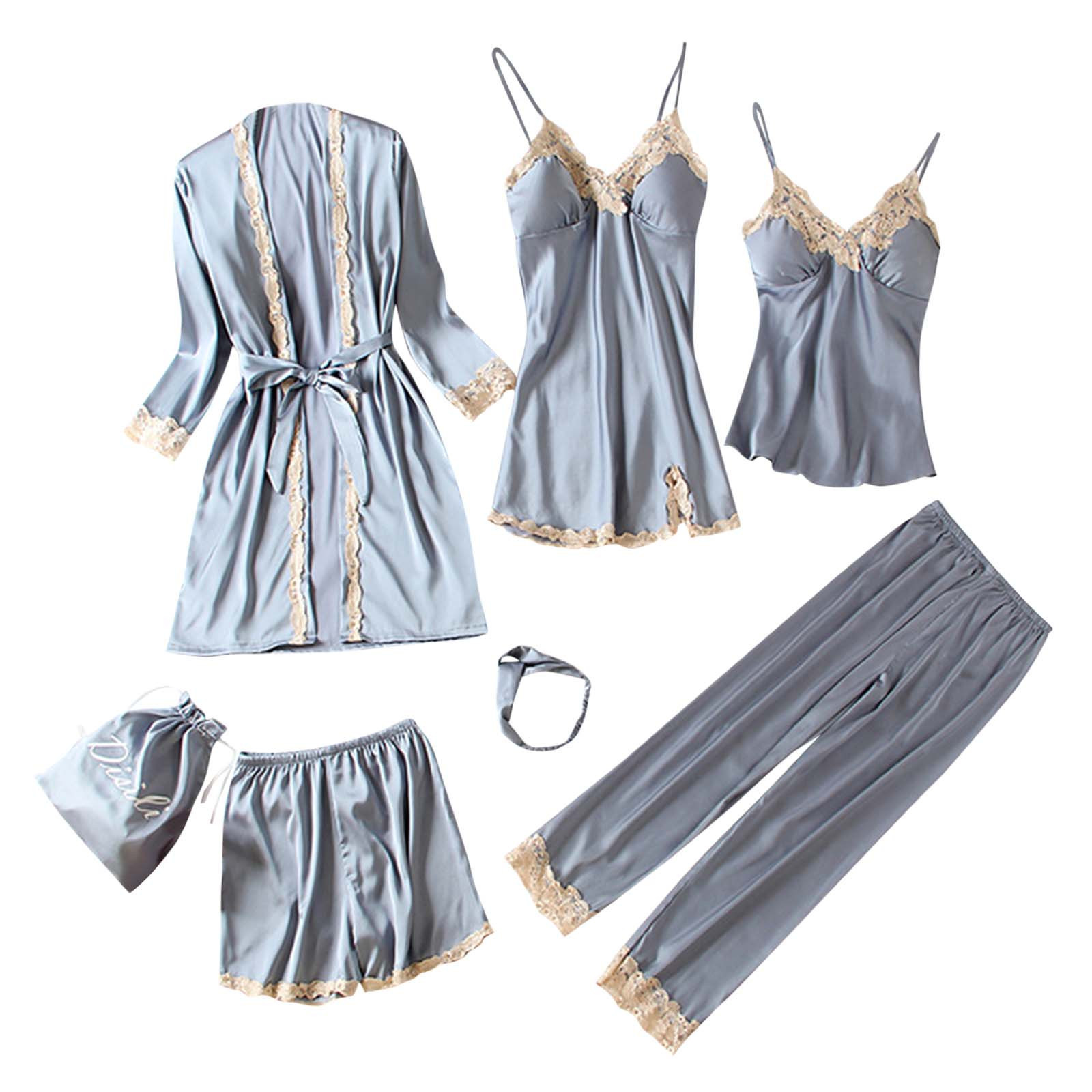 Timoontee Womens Pajama Sets 7PCS Silk Pajamas for women Cute Sleepwear Loungewear Satin Pajamas Sets for Women Soft Gray 6