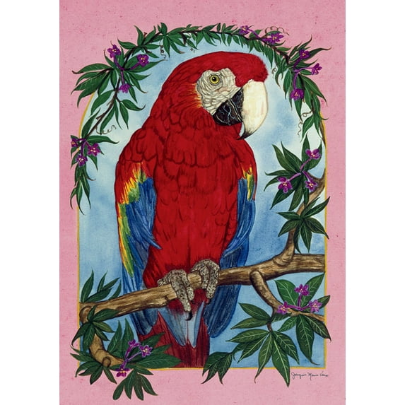 Elevate your outdoor space decor with this tropical outdoor house flag. This flag depicts a vividly colored parrot nestled amidst lush greenery and vibrant purple blooms, injecting a burst of tropical charm into any garden or patio. Crafted with durability in mind, it's UV, fade, and mildew-resistant, ensuring long-lasting beauty even in the harshest of weather conditions. Product features: Tropical outdoor house flag. Portrays a vividly colored parrot resting on a branch amidst lush greenery and vibrant purple blooms. UV, Mildew and fade-resistant . Flags hang beautifully from a sewn-in sleeve. Printed in the USA. Care instruction: machine washable. Fits most standard garden flagpoles and stands (not included). Design is printed on one side only - visible from both sides. Recommended for outdoor use. Dimensions: 40" high x 28" wide. Material(s): polyester. Note:Design is one-sided with the image printed and visible from both sides while text appears correctly on one side