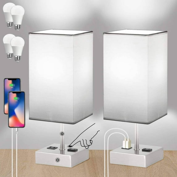 Touch Control Table Lamp Set of 2 Are you still looking for a stylish and simple 2 table lamp? The white bedside lamp is made up of a mini metal base and a fabric shade that is designed to last longer and bring a modern feel to your home In addition,this lamp is an ideal birthday, thanksgiving, new year, or any festival gift for your families and friends Table Lamp with 3 Color Modes With these touch control table lamps, you don’t need to fumble for a tiny switch at night any more. Different from pull chain switch or rotary switch, our table lamps with touch control sensor can offer superior convenience to your daily life because you can get light by just tapping anywhere of the pole or base of the lamps. It should be noted that there are three distinctive brightness levels preset to serve your lighting needs. You can have desired brightness for whatever you are doing. Bedroom Lamp with USB Ports & Outlet This nightstand lamp has two useful 5V/2.1A USB charging ports and one 2-Prong AC Outlet on the base, it’s so convenient to charge your different devices at the same time, such as mobile phones, tablets, kindle readers and so on. You can use them regardless of whether the light is on or off. This nightstand lamp comes with white fabric linen lamp shade and nickle base, bring stylishly and functionality to your home's interior with this simple aesthetic Table Lamp. The usb table lamp comes with 4 LED Bulbs, dual 2700K Warm White Bulbs and dual 5000K Cool White Bulbs, you can exchange the bulb depends on your needs. The bulb is 9W, brightness 810 lumen, NO FLICKER, NO DAZZLE.