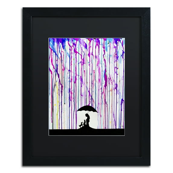 This ready to hang, matted framed art piece features the silhouettes of a woman and her small pets under an umbrella while colorful watercolor rain falls around them.