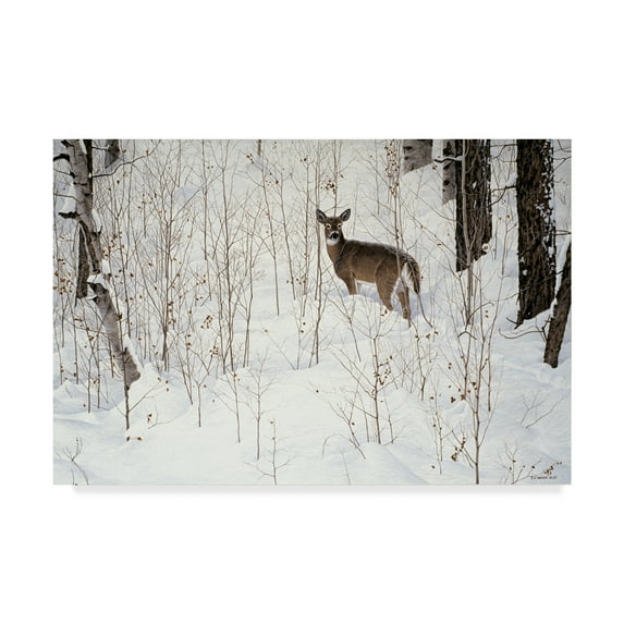 This ready to hang, gallery-wrapped art piece features a deer making its way across the snow covered ground.