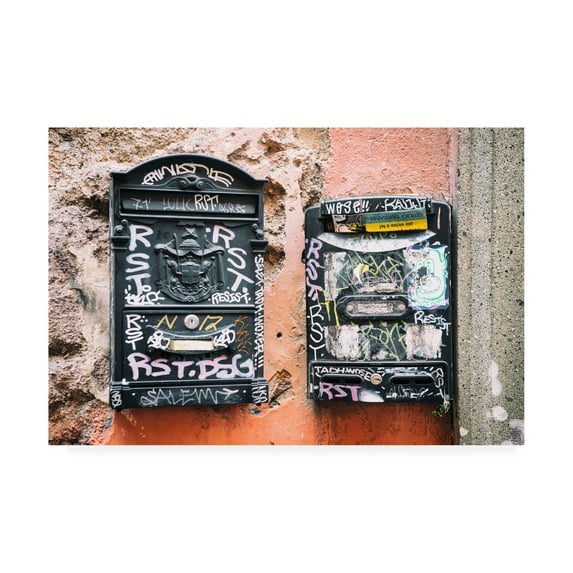 This ready to hang, gallery-wrapped art piece features two dark mailboxes on a stone wall.