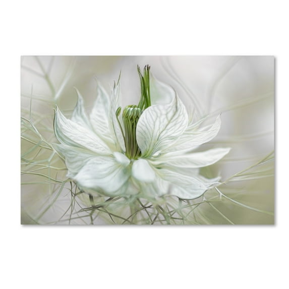 This ready to hang, gallery-wrapped art piece features a white flower in the center of the frame with a blurred scene in the background.