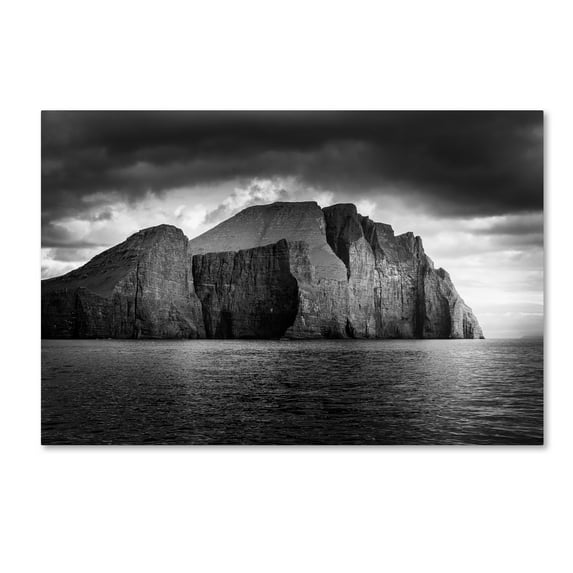 This ready to hang, gallery-wrapped art piece features a black and white image of a massive rock formation in the ocean under a stormy sky.