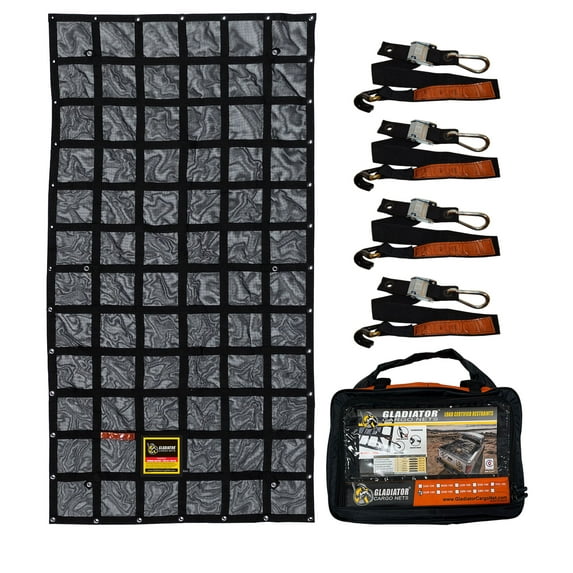 Eliminate the risk of a hefty fine and reduce your chances of losing cargo by keeping your loads covered and secured with the Gladiator Cargo Net. Used by large and small fleets across the country it is the highest rated cargo net on the market. It has earned this by being easy to use, incredibly strong and durable. Every cargo net comes with four heavy-duty straps. The hardware hooks are rubber coated to protect your vehicle. 1.5” inch thick straps which extend from 10” in - 3' ft.