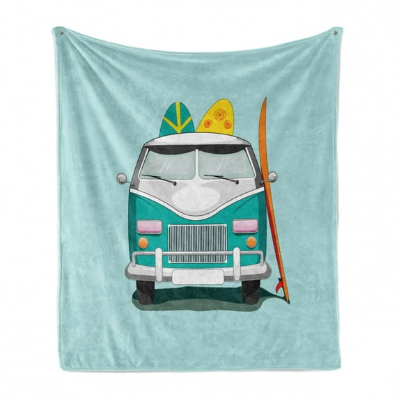 Hero image 0 of Travel Soft Flannel Fleece Blanket, Cartoon Front View Layout of Vintage Van and Colorful Surfboards Print, Cozy Plush for Indoor and Outdoor Use, 50" x 60", Pale Blue and Multicolor, by Ambesonne, 0 of 5