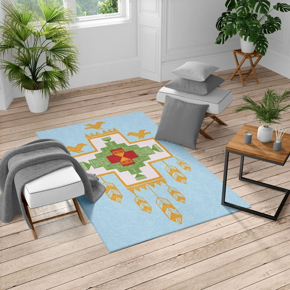 Hero image 0 of Tribal Turkish Area Rug, Hand Drawn Dreamcathcher Folkloric Birds Image Ethnic Ikat Design, Soft Carpet for Living Room Decor, 2.6' x 5', Pale Blue Dark Yellow, by Ambesonne, 0 of 4