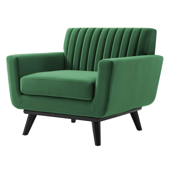 Gently sloping curves and a plush seat cushion create a favorite lounging spot. Whether relaxing after a long day at work, settling in with coffee and brunch, or entering a spirited discussion with friends, the Engage Armchair is a welcome presence in your home. Channel tufting creates eye-catching appeal, adding depth that brings your sitting décor to center stage. The black painted rubberwood legs and frame offer a solid base for the stain-resistant performance velvet upholstery.