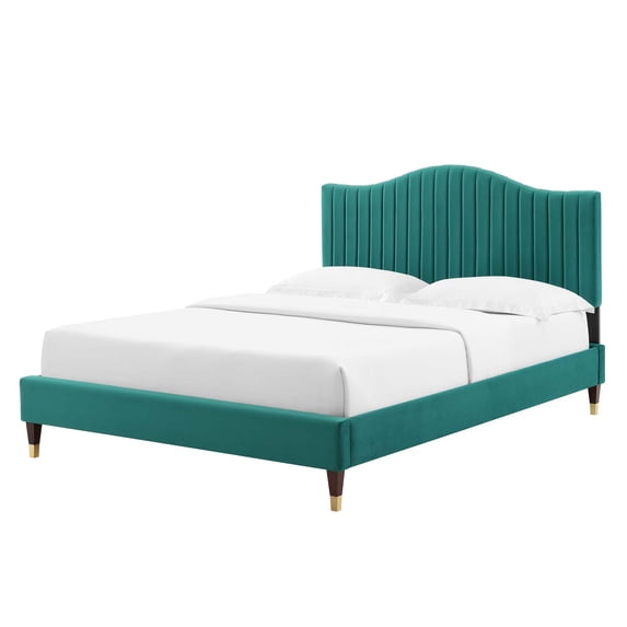 Bring opulent style to the bedroom with the Juniper Performance Velvet Platform Bed. The channel tufting, sweeping curved silhouette, and rich texture of the twin size headboard introduces glam deco style and vintage modernity to a kid's bedroom or guest bedroom. A twin size bed frame covered in stain-resistant performance velvet, this upholstered bed frame is a sturdy mattress foundation for memory foam, innerspring, latex, and hybrid mattresses. Eliminating the need for a box spring, the MDF frame of this twin bed is complete with a wood slat support system crafted with poplar for lasting durability and support. This slatted bed frame rests on wood legs with gold metal sleeves and non-marking foot caps and includes a reinforced center beam with two support legs for enhanced stability. Assembly required. Twin Bed Weight Capacity: 800 lbs.