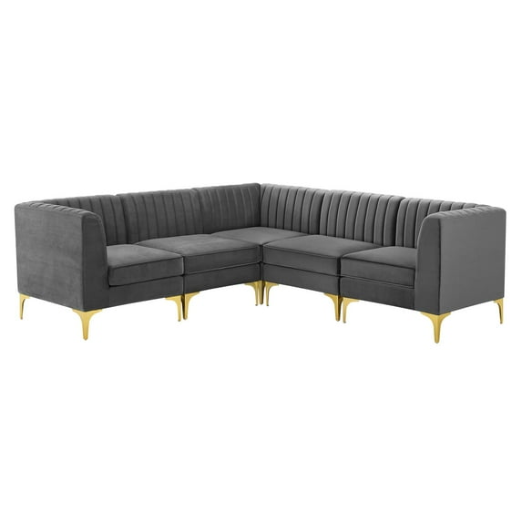 Elevate your living space with the visual appeal and linear detail of the Triumph Channel Tufted Performance Velvet 5-Piece Sectional Sofa. With interior channel tufting and luxe velvety texture, this sectional sofa abounds in retro modern style and glam deco charm. This couch is part of a sectional sofa collection that allows you to create a seating solution that works for your living room, bedroom, office space, entryway, or lounge area. This upholstered sectional sofa is covered in stain-resistant performance velvet and features dense foam padding and a sinuous spring support system for a premium seating experience. The velvet sofa sits on four gold metal legs with non-marking foot caps to protect your flooring. Weight Capacity for Each Sectional Sofa Piece: 440 lbs.