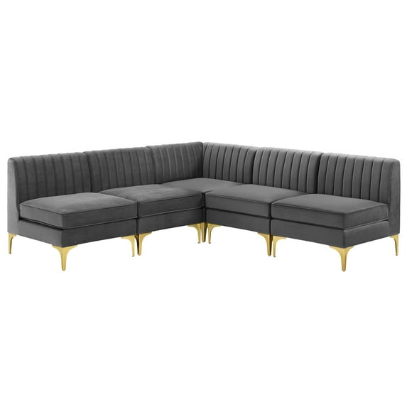 Elevate your living space with the visual appeal and linear detail of the Triumph Channel Tufted Performance Velvet 5-Piece Sectional Sofa. With interior channel tufting and luxe velvety texture, this sectional sofa abounds in retro modern style and glam deco charm. This couch is part of a sectional sofa collection that allows you to create a seating solution that works for your living room, bedroom, office space, entryway, or lounge area. This upholstered sectional sofa is covered in stain-resistant performance velvet and features dense foam padding and a sinuous spring support system for a premium seating experience. The velvet sofa sits on four gold metal legs with non-marking foot caps to protect your flooring. Weight Capacity for Each Sectional Sofa Piece: 440 lbs.