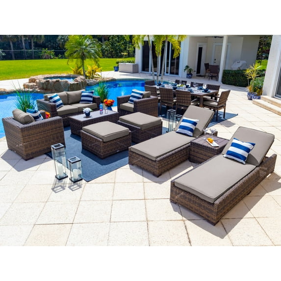 - LUXURY OUTDOOR LIVING: Bring elegance and a high-class atmosphere to your outdoor space with the Tuscany Collection. Complete with a sofa lounge set, eight-seat dining set, and chaise lounge set, this combination set comes with everything you need to reinvent your entire backyard patio. *THROW PILLOWS NOT INCLUDED*