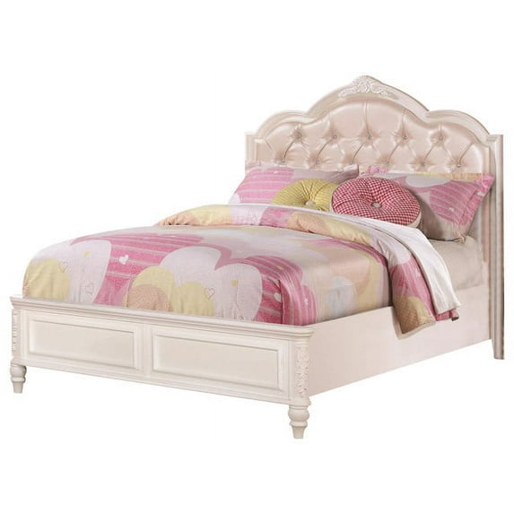 Add a dash of glamour to a girl's bedroom décor with this twin bed. The details found in this bed are glamorous and unexpected. The headboard is upholstered in a pink metallic faux leather under a partitioned section covered in a textured panel. Button-tufted further accentuate its glamourous aura. With a pure white finish frame, this bed fits perfectly with the classic or princess style furniture.