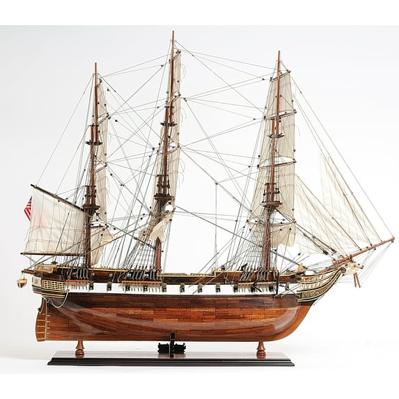 On 27 March 1794, the United States Congress passed the Naval Act of 1794, which provided for building the US Navy its first new ships: the frigates Chesapeake, Congress, Constellation, Constitution, President, and United States. Constellation was the first to be commissioned. Constellation was built at Harris Creek Shipyard in Baltimore?s Fells Point and launched on 7 September 1797, just as the United States entered the Quasi-War with France. On 9 February 1799, under the command of Captain Thomas Truxtun, Constellation fought and captured the frigate L?Insurgente of 36 guns, the fastest ship in the French Navy ? the first major victory by an American-designed and built warship. In February 1800 Constellation fought a night encounter with the frigate La Vengeance of 54 guns. Constellation was victorious after a five-hour battle. The French commander just managed to save his ship from capture and -upon returning to port- was so humiliated he later boasted that the American ship he had fought was a much larger and more powerful ship of the line. Since the encounter, the Constellations incredible speed and power inspired the French to nickname her the "Yankee Racehorse?.This is museum-quality, FULLY ASSEMBLED replica of the U.S.S. Constellation, last sail-only warship designed and built by the U.S. Navy. This is an ?Exclusive Edition? where the model has a unique serial number etched into the hull, which allows us to identify production date, material used and all other production information of a model. Master craftsmen using historical photographs, drawings or original plans meticulously handcraft these highly detailed wood models from scratch. They are built to scale with high-grade wood such as: western red cedar, rosewood, and mahogany. They are 100% hand built individually using plank-on-frame construction method and are similar to the building of actual ships. Each model requires hundreds of hours to finish and must go through a demanding quality control process before leaving the workshop. This amazing model of the USS Constellation features plank on frame, two decks, and one stretched ferocious row of metal cannons on each side of the ship. The front bowsprit and three large masts are connected securely using advanced rigging and lines painstakingly knotted and fastened by hand. Each yard has an attached hand-stitched rolled-up sails made of fine linen. The glorious American flag are attached to the mizzen yard. Metal anchors and a wooden rudder are visible on the front and rear of the ship. On the deck, there are stationed metal cannons, metal steering wheels, wood ladders and crane, captain?s dining and sleeping cabin, and many other handcrafted ornaments. There is also an exquisite detailed admiral?s quarter on the stern with beautiful decorative brass ornaments and an authentic hand-built lifeboat with ribs and planks. This model comes standard with a solid wood base and brass nameplate. It?ll make a perfect gift for home or office decorator, boat enthusiast or passionate collector.