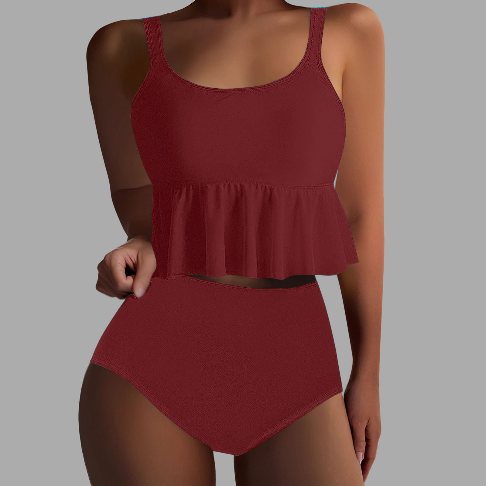 UTSJKR Cute Two Piece Bathing Suits Women Ruffle Flounce Crop Top High Waisted Bikini Set Swimsuit Tummy Control Swimwear Wine XL