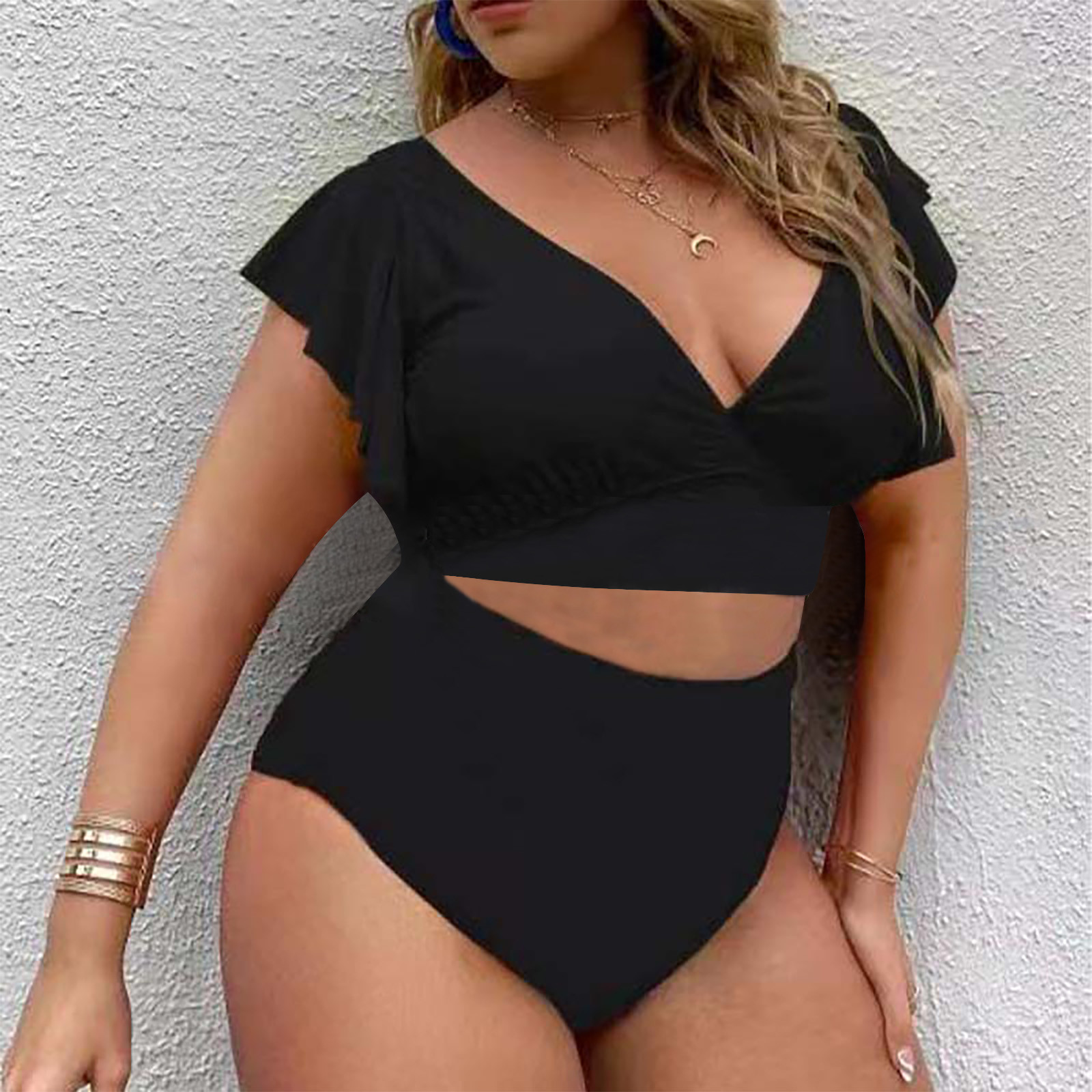 Hero image 0 of UTSJKR Deals Plus Size Womens High Waisted Bathing Suits Tummy Control Two Piece Swimsuits Ruffle Bikini Sets Criss Cross Ruched Swimwear Black XXXXL, 0 of 5