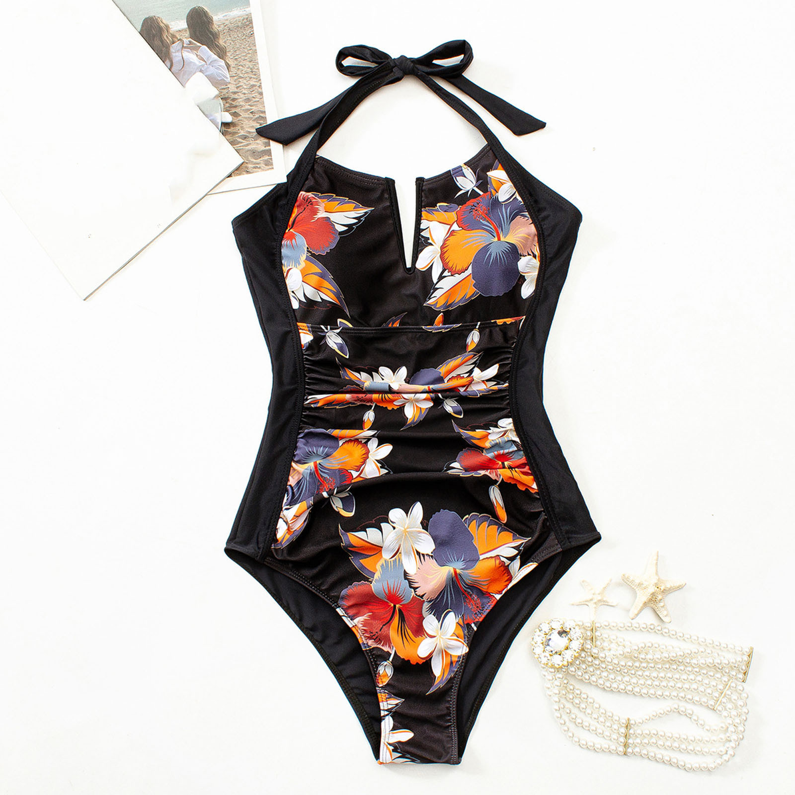 Hero image 0 of UTSJKR Women's Halter Push Up High Waisted Bathing Suit Tie Dye Print Sexy One Piece Swimsuits Retro Ruched Swimwear Black M, 0 of 4
