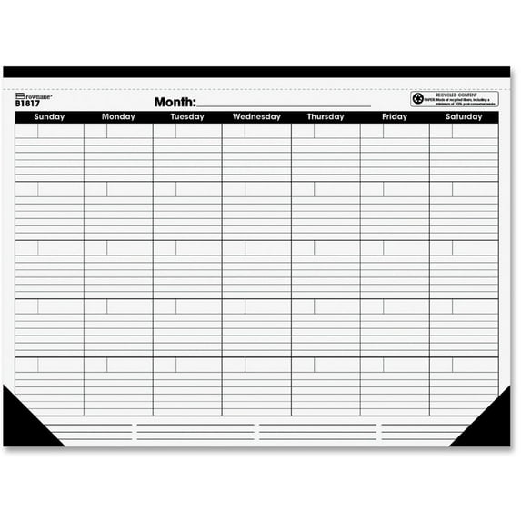 Start your year on whatever month you choose with this undated monthly desk pad. The one-page-per-month format offers spaces to fill in the month at the top and dates in ruled daily blocks. The grid is only labeled with the days of the week from Sunday to Saturday. The bottom of all 12 monthly pages includes long, bold lines for notes. Sheets are bound at the top and perforated for easy tear-out. The desk pad features a reinforced backing card to protect your desk and offer a firm writing surface. Two black corners at the bottom secure the monthly pages in place. FSC certified desk pad is made with recycled paper with post-consumer material.