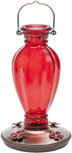 You'll attract more hummingbirds to your feeder with this Perky-Pet Antique Bottle Glass Hummingbird Feeder. There is nothing quite as charming as these tiny birds and this red antique bottle will welcome them to your yard. It has a 16 oz nectar capacity so you will have to fill it less often. The four decorative feeding ports can serve several birds at one time. The hardened glass nectar container is sturdy and durable. The brushed-copper base and the deep ruby color of the feeder itself will add an attractive feature to your yard or patio. When you need to clean your Perky-Pet hummingbird feeder, all you need to do is detach its base. You'll have hours of fascinating fun watching these compelling creatures as they pollinate your flowers and plants. This decorative hummingbird feeder will entertain not only the birds but your friends and family as well.