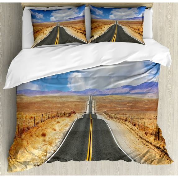 Hero image 0 of United States Duvet Cover Set Queen Size, Highway in California Steppe and Clouds Asphalt Road Horizon Hills Journey, Decorative 3 Piece Bedding Set with 2 Pillow Shams, Multicolor, by Ambesonne, 0 of 3