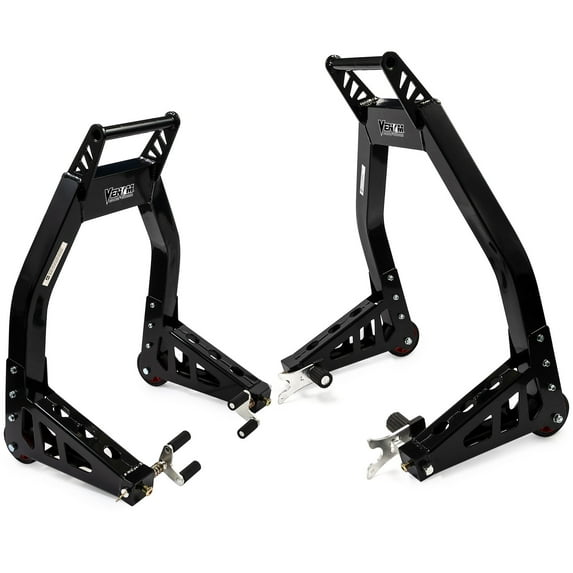 - MOTORCYCLE STANDS FRONT AND REAR: Presenting to you the Venom motorcycle combo lift stand. This motorcycle lift stand set includes a front fork stand and rear 2-in-1 lift attachment (swingarm spool "Y" lift and swingarm paddle lift). Our motorcycle stands are made of black, high-grade aluminum and fit all full-size front-fork sport bikes.