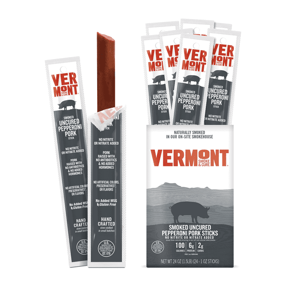 - Vermont Smoke & Cure's 24-pack of 1 oz Smoked Uncured Pork Pepperoni Sticks offers a bold, spicy pepperoni flavor, expertly crafted with paprika, fennel, garlic, and red pepper flakes for rich, authentic layers of taste. No nitrites or nitrates added.