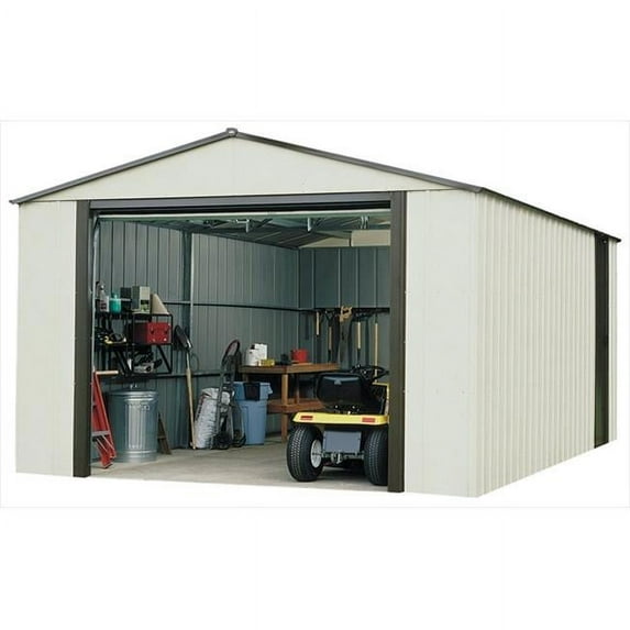 Get the benefits of our largest building with the 14 x 31 ft. Vinyl Murryhill steel storage building from Arrow. With 3,663 cubic ft. of space, this extra large shed can store many of your largest items. The vinyl coated galvanized steel provides a five times thicker finish than standard steel finishes. The tall interior peak height is over 9 ft. tall for tremendous head room and work space. A sliding side door permits random placement and gives added access to your stored items. The large roll-up garage door is 106 0.5 W x 91.75 H in. and opens to accommodate your largest equipment form tractors, trailers, small boats to the largest riding mowers. Pre cut pre drilled parts help speed assembly and make the Vinyl Murryhill from Arrow a superb storage value. A concrete slab is a recommended base for this storage building.