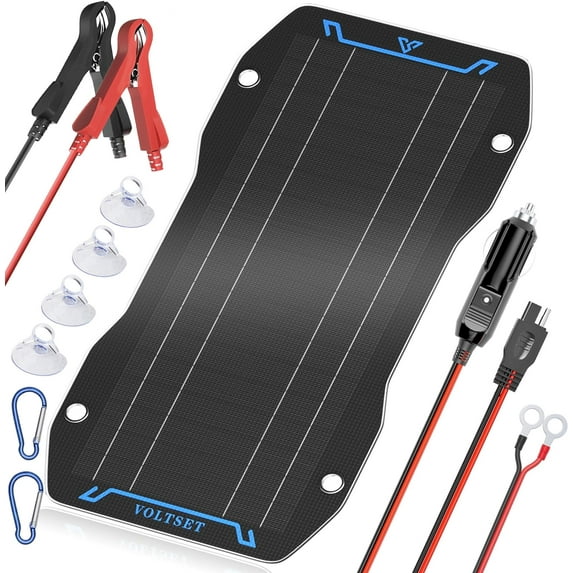 - 🔋【Widely Used】The solar panel battery charger comes with 3 different SAE cables, plug and play. Also features snaps and suction cups for easy installation and cleaning. Widely used as solar battery maintainer for 12V batteries and DC charging equipment, such as cars, RVs, motorcycles, boats, ATVs, etc. VOLTSET provides 24/7 professional customer service and a 12-month warranty. Hope to solve your problem in time.