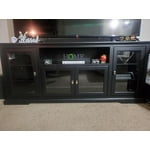 With a versatile design, this console can make a wonderful accent console in your entryway or an entertainment center in your living room. Plenty of storage space behind glass paneled cabinets for your movies, CDs, and electronics, or decor. The adjustable shelving makes it easy for you to fit the items you need to, to keep your living space clean. This TV stand can accommodate most flat-panel TVs up to 80-inches. Crafted from manufactured wood, this media console has a traditional style that's timeless.