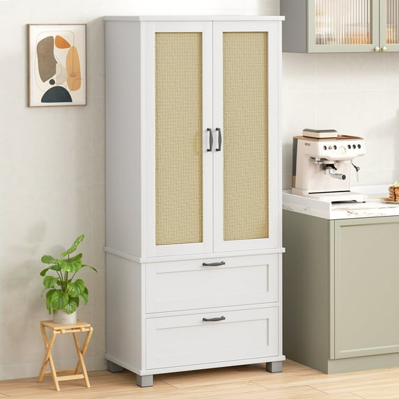 Walsunny 64" kitchen Pantry Cabinet with Rattan Doors and 2 Drawers, Freestanding Tall Storage Cabinet with Wine Rack Rattan Pantry White