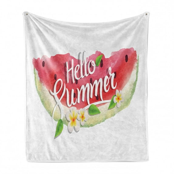 Hero image 0 of Watercolor Soft Flannel Fleece Throw Blanket, Hello Summer Words with Fresh Watermelon and Poppies Picture, Cozy Plush for Indoor and Outdoor Use, 70" x 90", Pink Mint Green, by Ambesonne, 0 of 6