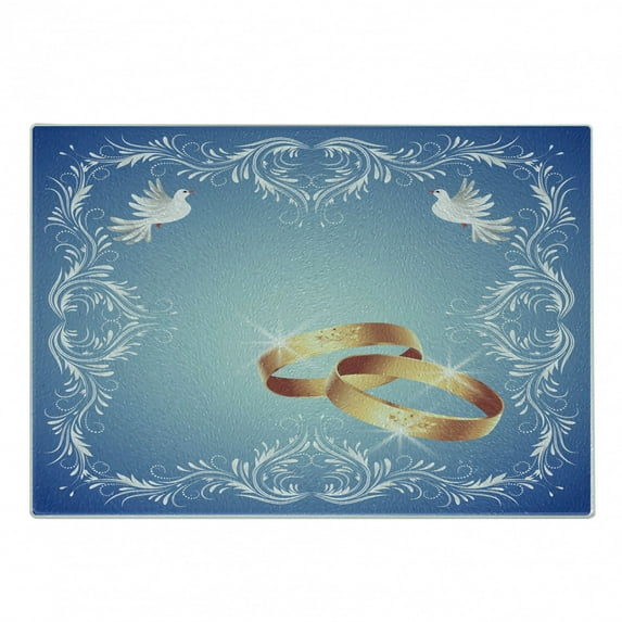 Hero image 0 of Wedding Cutting Board, Celebration Ornament Frame 2 Flying Doves Heart Shapes Wedding Rings, Decorative Tempered Glass Cutting and Serving Board, Small Size, Blue White Pale Caramel, by Ambesonne, 0 of 1