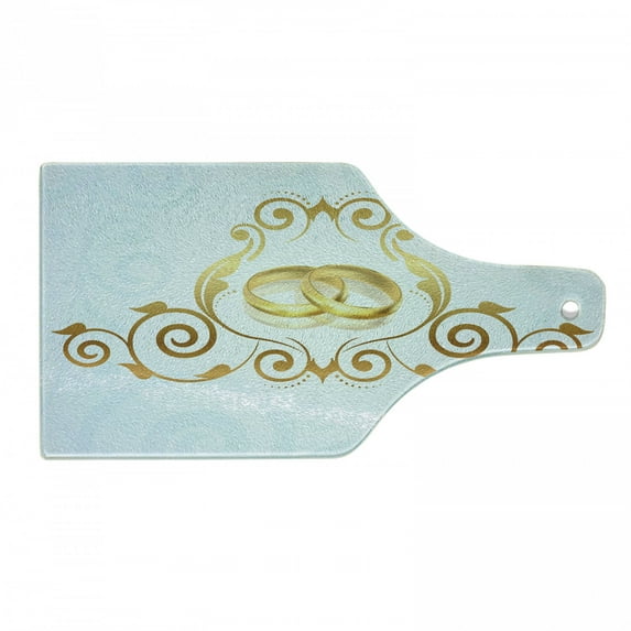 Hero image 0 of Wedding Cutting Board, Vintage Style Victorian Ornaments on Blue Backdrop Rings Celebration, Tempered Glass Cutting and Serving Board, Wine Bottle Shape, Pale Blue Caramel Yellow, by Ambesonne, 0 of 1