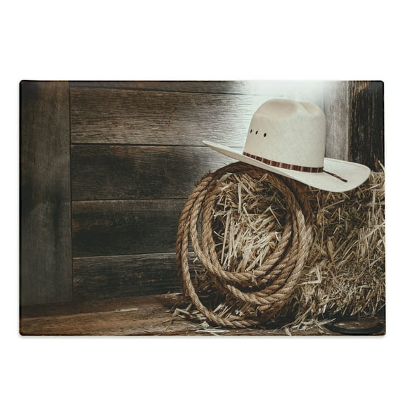 Hero image 0 of Western Cutting Board, American West Rodeo Hat Traditional Ranching Robe on Wooden Ground Folk Art Photo, Decorative Tempered Glass Cutting and Serving Board, Large Size, Brown Beige, by Ambesonne, 0 of 1