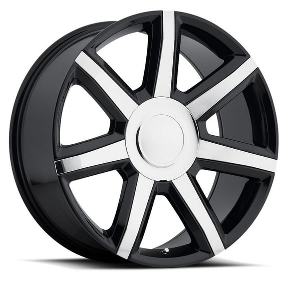One of the newer Escalade wheel options, the Escalade Luxury Replica Wheel keeps your SUV current . The clean 7 spokes each have a plastic chrome insert that extends from lip to cap creating a two tone appearance. The removable inserts can be custom coated to match the trim of your vehicle producing a bold look that is sure to draw attention. Whether you choose the chrome or gloss black finish for the rims, your Escalade will certainly radiate luxury. Escalade Luxury Replica offered in multiple finishes with applications to fit Chevrolet, GMC, and Escalade Suv/Trucks.