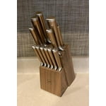 Okay I see you Walmart, coming through with this absolutely beautiful 13 PC Stainless Steel Knife Set. This knife set definitely gives a luxury high end and modern style appearance. The handles on this 13 pc set are an elegant copper color and all the blades are nice and sharp. It does come with a knife sharpener to maintain them conveniently sharp. The set also includes a walnut wood block that just perfects and completes this high quality product. The packaging of the box and of the actual knives is also impressive. I positively love my knife set and I definitely recommend it. It would look great in any kitchen.