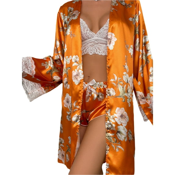 - ROBE PAJAMAS: Lace patchwork, printed, long sleeves, detachable belt, loose fit for easy movement, women's kimono bathrobe, matching lace bra and shorts for easy on and off.