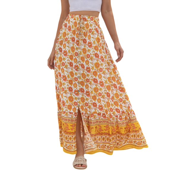 Womens High Waist Floral Pleated Skirt,Stylish Bohemian Comfy Midi Swing Skirt A Line Long Maxi Skirt Half Dress,Cute Front Split Ankle Length Summer Beach Soft Skirt,Yellow XXS-LWomens High Waist Floral Pleated Skirt Stylish Bohemian Comfy Midi Swing Skirt Line Long Maxi Skirt Half Dress Cute Front Split Ankle Length Summer B