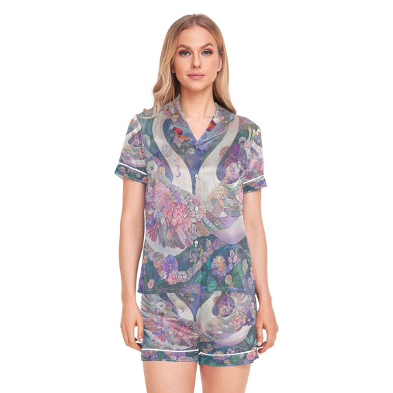 Women Silk Pajama Sets Causal Outings Fashion Swan Love in Bloom Pattern Home