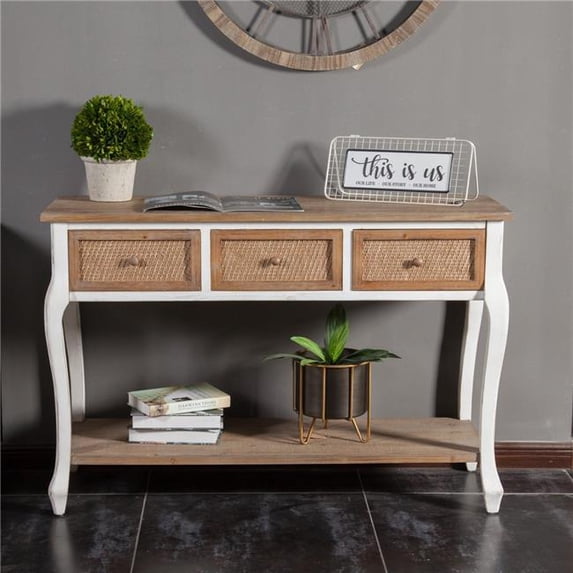 From entryway to dining room, this stylish console table with its weaved wood finish drawers, slightly distressed white body and legs, and natural wood finish top and bottom shelf provides a functional furniture item that is also stylish. This console table can function as a sofa table, entryway table, or small buffet. Features include wood construction, three storage drawer, open storage shelf, and curved legs.The table stands 31.7 inches high, and is 47.3 inches wide. It includes three pull out drawers, and has a bottom shelf for convenient storage that is ideal for your extra blankets and other knick-knacks.