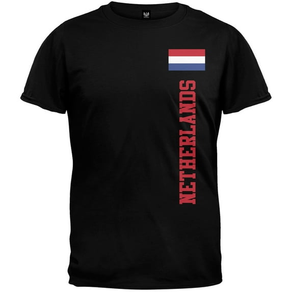 A vertical Netherlands flag logo is printed on the front of this black, 100% cotton t-shirt. Great for sports fans and Dutch patriots alike.