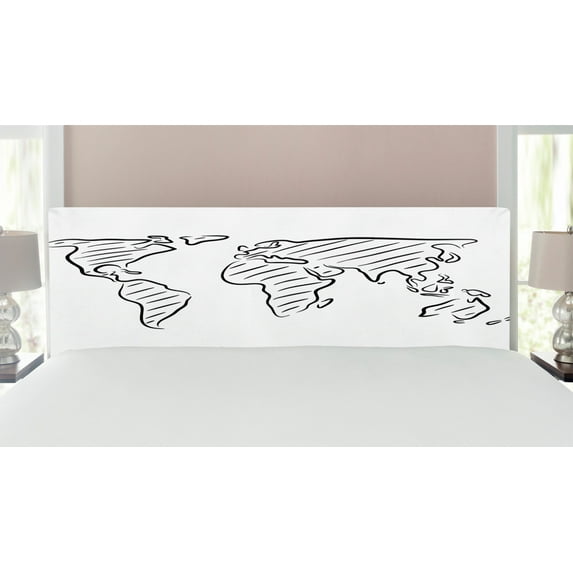 Hero image 0 of World Map Headboard, Illustration of Outline Sketch of the World Map in Drawing Effect Art Print, Upholstered Decorative Metal Bed Headboard with Memory Foam, King Size, Black White, by Ambesonne, 0 of 4