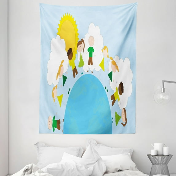 Hero image 0 of World Tapestry, Smiling Kids over Planet Drawing All Children of the World Happy Friendship Peace, Wall Hanging for Bedroom Living Room Dorm Decor, 60W X 80L Inches, Multicolor, by Ambesonne, 0 of 2