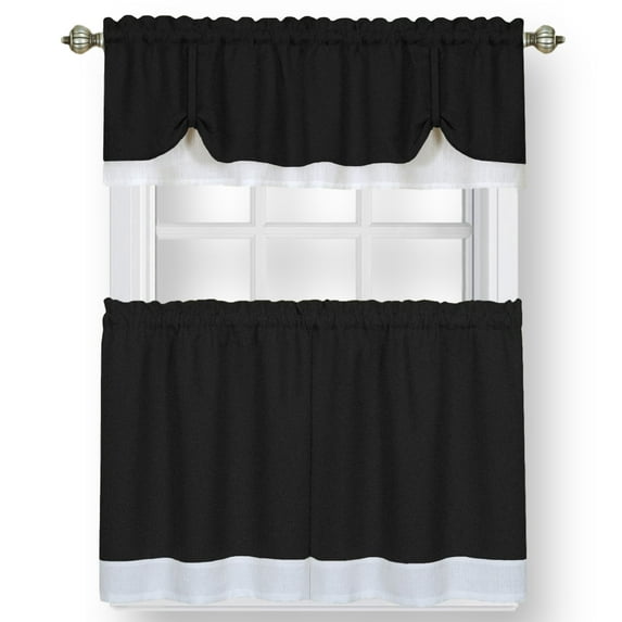 Woven Trends Two-Tone Window Curtain Tier Pair & Valance Set, Double Layer Small Window Curtains for Kitchen, Living Room and Kitchen, Black/White, 58" x 36" Tier Pair & Valance Set