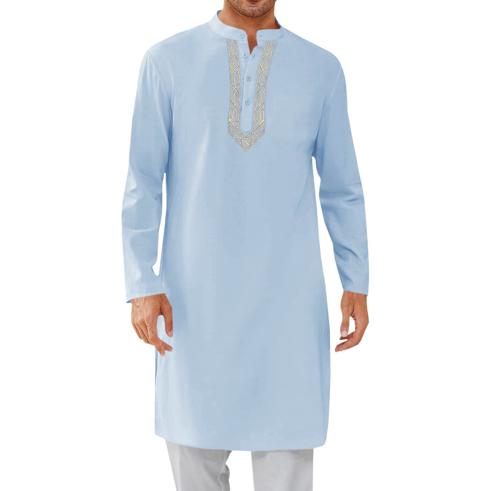 YLSDY Fashion Mens Kaftan Thobe Button Down Casual Henley Shirts Long Sleeve Robe Cotton Linen Muslim Gown Shirt Blue L