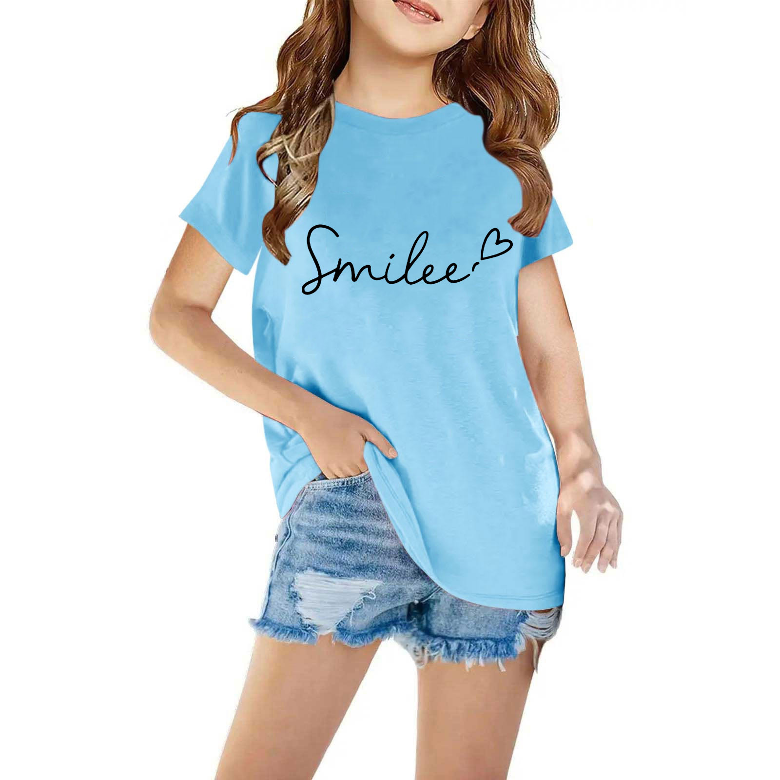 Hero image 0 of YLSDY Girls T Shirts Funny Smilee Letter Print Graphic Shirts Kids Short Sleeve Crew Neck T Shirt Casual Summer Tees Tops Light Blue 9 Years, 0 of 3