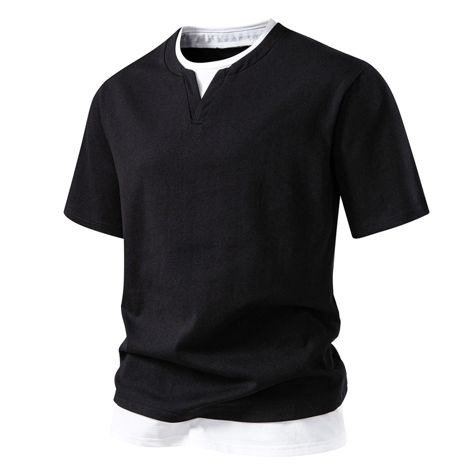 YLSDY Mens Cotton Casual Shirts Summer Short Sleeve Double V Neck T Shirts Lightweight Loose Fit Yoga Shirts Holiday Shirts Black XL