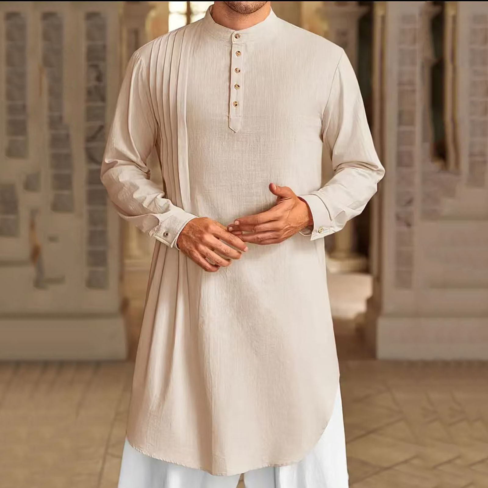 YLSDY Mens Kaftan Thobe Button Down Henley Shirts Robe Long Sleeve Casual Cotton Pleated Muslim Gown Shirt Khaki XL