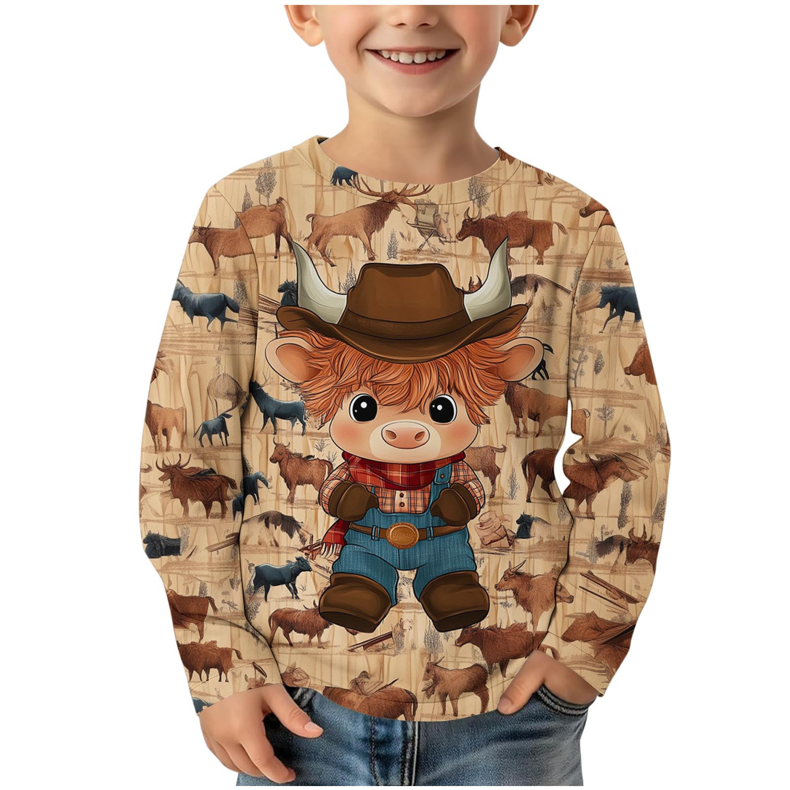 YLSDY Rollbacks Boy's Novelty T-Shirt Cartoon Cowboy Print Long Sleeve Shirts Casual Crewneck Top Pullover Tees Top Spring Clothes 3-14 Years Khaki 7 YearsGirls Long Sleeve Prints Shirts Cute Crewnecks Tops Dressy Casual Blouses Clothes Round Neck Shirts