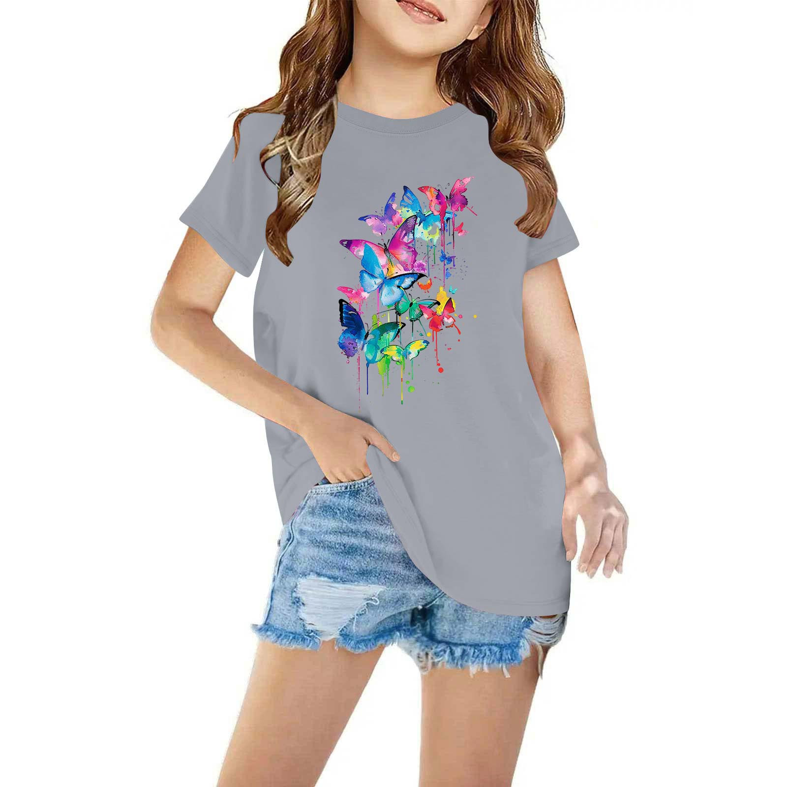 YLSDY Toddler Girl Summer Short Sleeve T Shirts Cotton Tops Cute Butterfly Print Little Kids Tee Shirt Clothes Gray 7 Years
